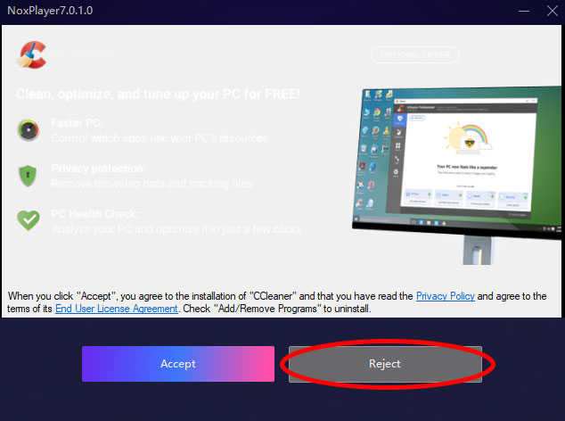 Nếu có cửa sổ hiện ra yêu cầu bạn cài đặt thêm ứng dụng khác thì hãy nhấn nút Reject để không đồng ý cài đặt những ứng dụng này. Ngay sau đó, NoxPlayer sẽ được cài đặt vào máy tính.