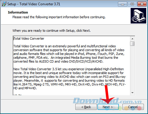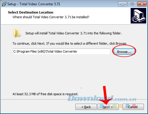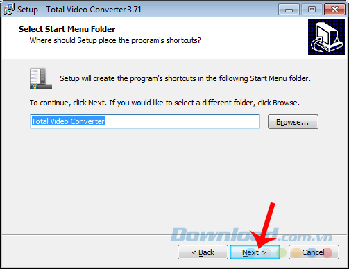 Bước 3: Có thể click vào Browse và tìm vị trí cài đặt cho phần mềm này trên máy tính theo ý thích, hoặc cũng có thể chọn luôn vào Next để cài đặt Total Video Converter vào ổ C (như đường dẫn gợi ý).