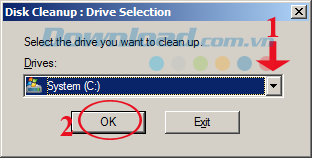 Bước 2: Cửa sổ Disk Cleanup: Drive Selection xuất hiện, bạn hãy chọn ổ đĩa muốn dọn dẹp bằng cách nhấn vào mũi tên xổ xuống ở mục Drives, thông thường chọn ổ đĩa C để dọn dẹp vì cài hệ điều hành và các ứng dụng vào đây.