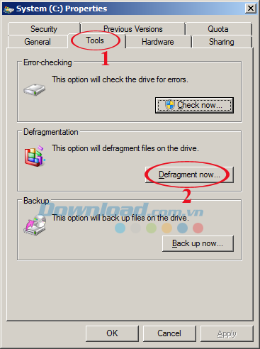 Bước 2: Cửa sổ tiếp theo xuất hiện bạn hãy nhấn vào thẻ Tools, rồi kéo xuống mục Defragmentation nhấn vào nút Defragment Now để chống phân mảnh ổ đĩa ngay.