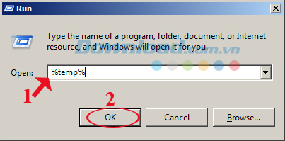 Bước 1: Mở cửa sổ Run lên, gõ lệnh %temp% vào ô Open. Rồi nhấn OK.
