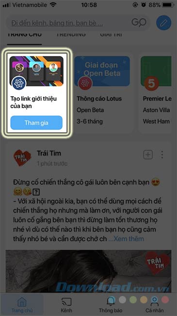 Bước 1: Các bạn đăng nhập vào tài khoản Lotus trên điện thoại của mình, sau đó chạm vào mục Tạo link giới thiệu của bạn (hoặc nút Tham gia) ngay trên giao diện Trang chủ.