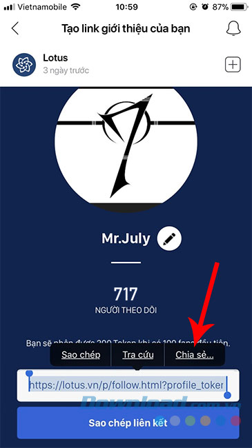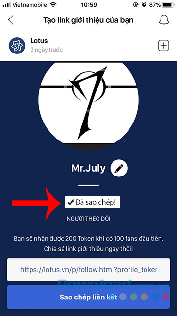 Đường dẫn này sẽ tự động hướng dẫn bất cứ ai click vào, nên đây ngoài việc là một cách giúp bạn có thêm bạn bè trên Lotus, còn là một cách để mạng xã hội này mở rộng, mời gọi thêm người dùng. Đặc biệt, nếu bạn đạt được 100 fans đầu tiên bằng cách này, Lotus sẽ thưởng cho bạn 200 Token vào tài khoản.