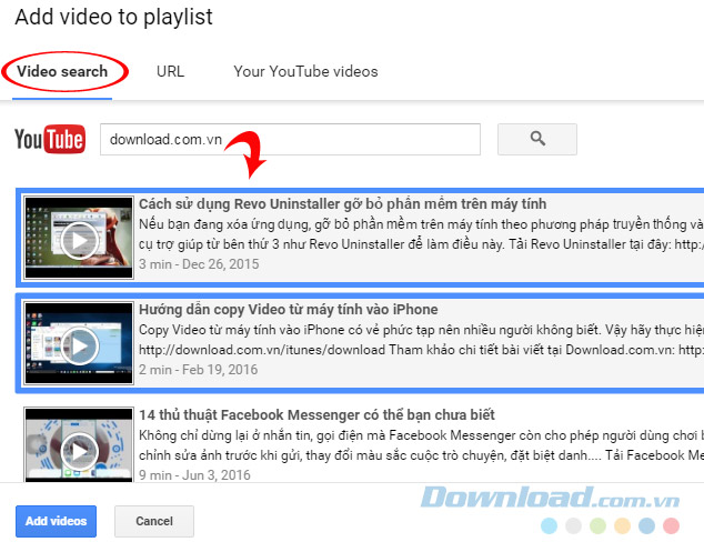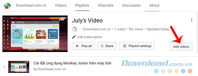 Vậy là danh sách của chúng ta đã có video đầu tiên, để thêm các video khác, chúng ta vào Add videos và làm tương tự.