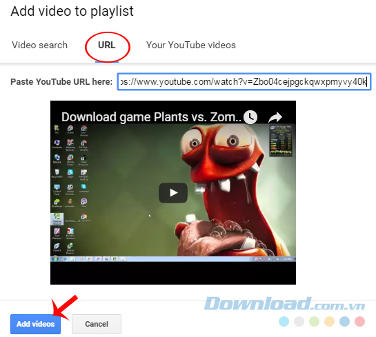 Chọn mục URL, sau đó copy và paste đường link vào ô Paste Youtube URL here, chờ một chút để video được nhận dạng, sau đó cũng chọn vào Add videos.