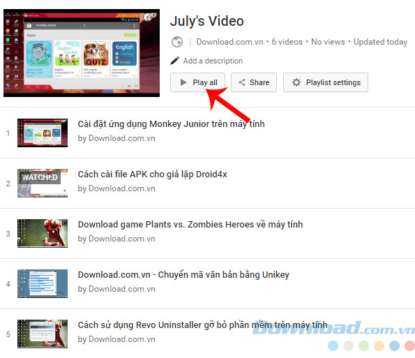 Sau khi đã có đủ số lượng cần thiết, chọn vào Play all để chạy toàn bộ playlist của chúng ta.