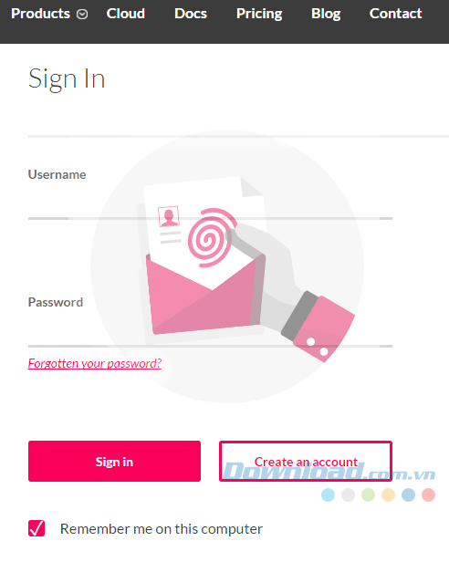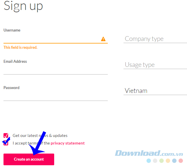 Bước 2: Tại giao diện tiếp theo, các bạn điền đầy đủ thông tin vào các trường bên dưới rồi tick chọn I accept the terms... và nhấp vào Create an account là xong.