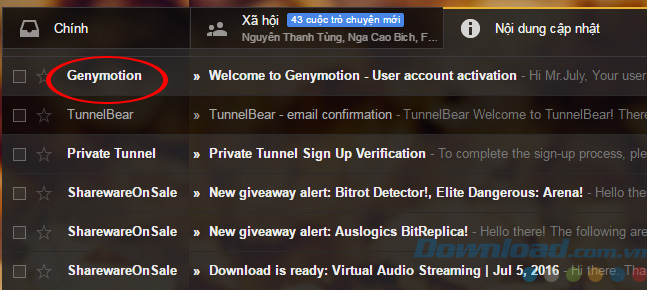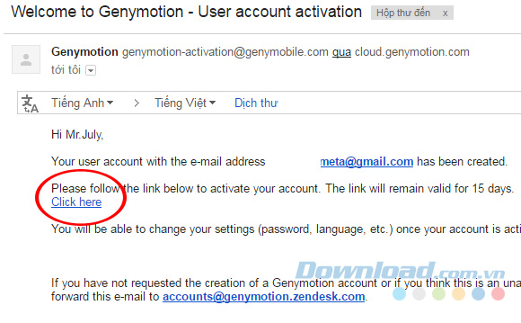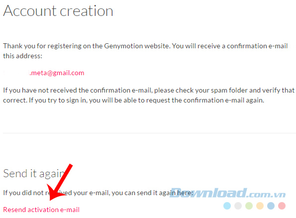 Bước 3: Kiểm tra trong hộp thư đến và tìm email của Genymotion, nếu sau vài phút không nhận được mail nào, các bạn có thể nhấp chuột vào Resend activation e-mail ở bước trước để yêu cầu gửi lại.