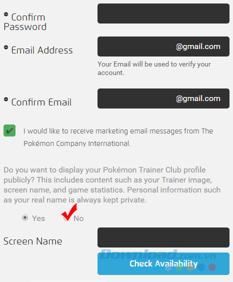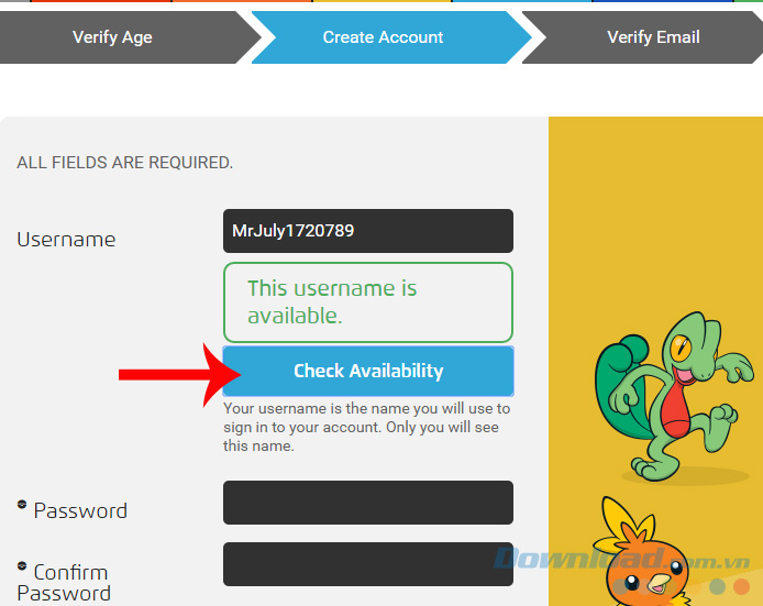 Cũng tương tự như khi tạo tài khoản trên điện thoại, sau khi đặt tên, cần click vào mục Check Availability để xem tên này đã có ai dùng chưa?