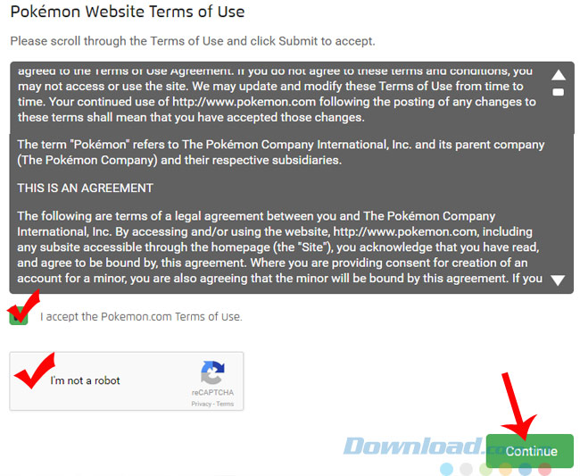 Bước 4: Tiếp tục đánh dấu tick vào I accept the Pokemon term of use và xác nhận trong phần I'm not a robot rồi Continue.