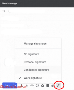 Bước 4: Trong phần soạn email mới, hãy sử dụng nút hình chiếc bút để chọn lựa mẫu chữ ký mà bạn đã lưu.