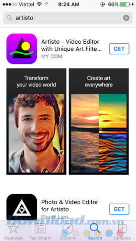 Bước 1: Các bạn truy cập vào App Store tìm kiếm và tải về ứng dụng "Artisto".