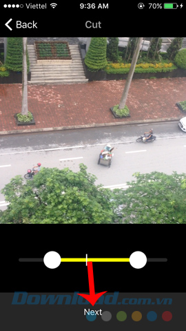 Chạm vào và giữ hai chấm tròn trắng, di chuyển tùy ý để chọn đoạn video cần xử lý, sau đó Next để tiếp tục.