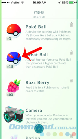 Bước 2: Tại đây, chúng ta kéo xuống và tìm loại Pokeball muốn sử dụng. Như trong bài này, người chơi đang sử dụng Pokeball dạng thường và muốn đổi sang Great Ball. Chỉ cần tìm và chạm vào nó để sử dụng là được.