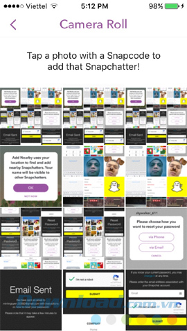 Cách này khá hay và đặc biệt, nhưng cũng rất ít người lựa chọn cách này. Ssau khi chọn mục Add by Snapcode, chúng ta sẽ được chuyển tới album ảnh của smartphone. Tại đây, các bạn tìm kiếm "mã Snap" để ứng dụng quét và xác nhận.