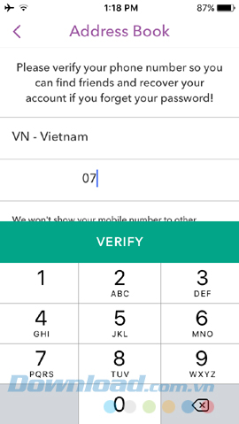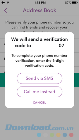 Với cách này, chúng ta sẽ phải nhập số điện thoại mình đang sử dụng vào, chọn tiếp Verify. Lúc này, Snapchat sẽ gửi cho các bạn một mã xác nhận vào số điện thoại ấy. Các bạn nhập mã này để xác nhận rồi chọn bạn bè từ danh bạ của mình.