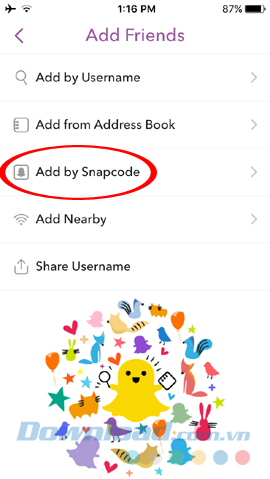 Sau đó chọn vào mục Add Friends, tiếp theo, chúng ta sẽ thấy 4 cách mà Snapchat cung cấp cho người dùng để thêm bạn mới: