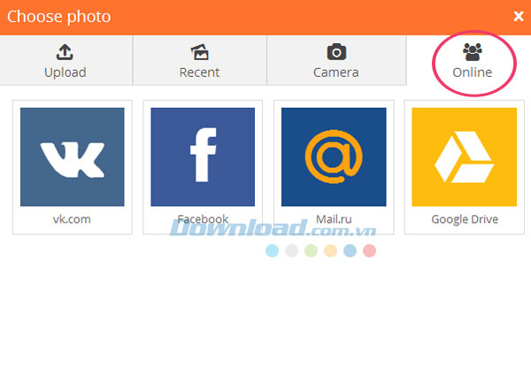 Hay, bạn muốn sử dụng các tấm hình có sẵn trên Facebook, Mail.ru, Google Drive hoặc vk.com thì nhấp chuột vào tùy chọn Online.