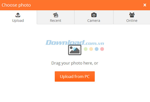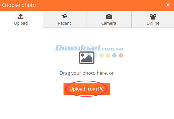 Chẳng hạn, nếu bạn muốn nhập ảnh có sẵn có sẵn trong máy tính thì cần kéo ảnh vào cửa sổ chương trình hoặc nhấn Upload from PC và chọn bức ảnh mong muốn.