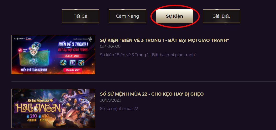 Cách đầu tiên cũng là cách đơn giản nhất để theo dõi các sự kiện mới nhất diễn ra trong Liên Quân Mobile đó là theo dõi thông qua trang chủ sự kiện. Tất cả những sự kiện chính thức ingame của Liên Quân Mobile đều sẽ xuất hiện tại đây.