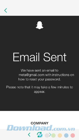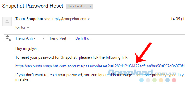 Sau khi hiện ra thông báo như "Emaill đã được gửi", các bạn truy cập vào hòm thư của mình và tìm thư của Team Snapchat vừa gửi, click vào chi tiết và mở đường dẫn bên trong ra.