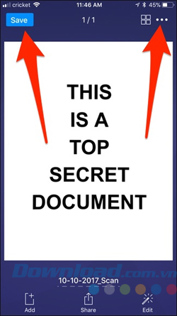 Bạn cũng có thể chỉnh sửa tài liệu đó bằng cách chạm vào Edit hoặc Add để thêm tài liệu. Trong trình đơn chia sẻ, bạn chọn loại định dạng muốn lưu trữ như PDF hay JPEG.