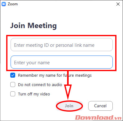Trong hộp thoại Join Meeting các bạn điền các thông tin về phòng học lần lượt: