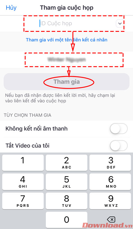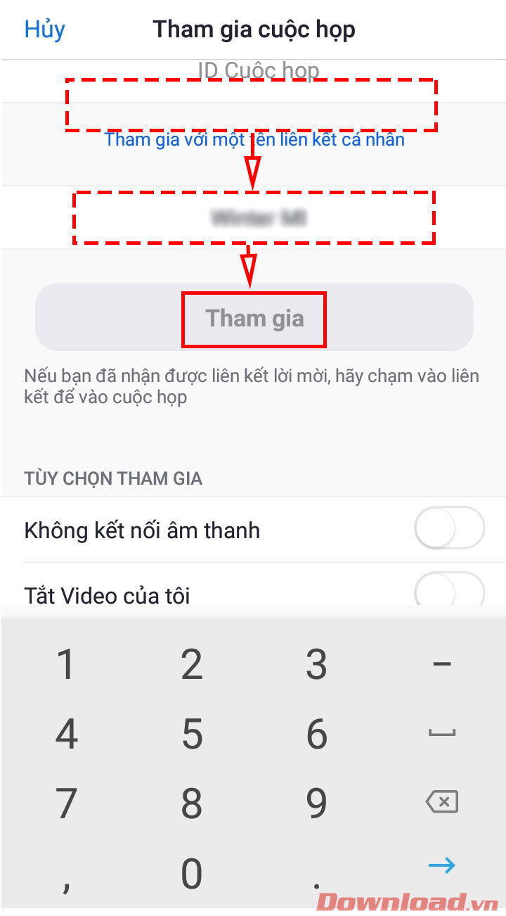 Điền đầy đủ thông tin gồm ID của phòng và tên bạn vào 2 ô trống sau đó nhấn nút Tham gia. Các bạn cũng có thể gạt nút phía dưới để tắt/bật kết nối âm thanh hoặc video.