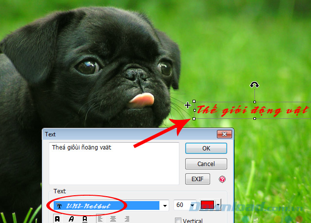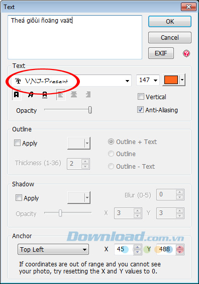 Sau khi đã chỉnh bảng mã của Unikey, font chữ của PhotoScape chúng ta có thể chọn tùy ý, miễn là nó bắt đầu bằng VNI.