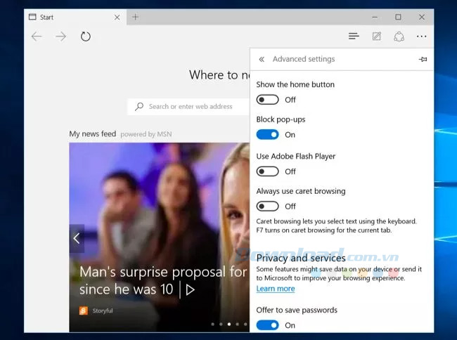 Từ giao diện chính của Edge, các bạn click vào Menu / Settings. Một bảng điều khiển hiện ra, click vào View advanced settings và kéo thanh trượt trong mục Use Adobe Flash Player từ phải sang trái để tắt đi.