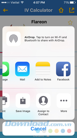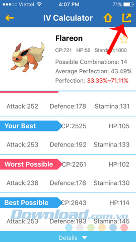 Không chỉ xem được, mà IV Calculator for Pokemon GO còn cho phép người chơi chia sẻ những thông tin này lên mạng xã hội Facebook bằng cách sử dụng biểu tượng Share ở góc trên, bên phải màn hình.