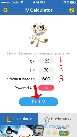 Bước 3: Sau khi chọn được Pokemon cần xem IV rồi, các bạn điền đầy đủ thông tin mà ứng dụng yêu cầu về Pokemon đó vào các mục tương ứng bên dưới.