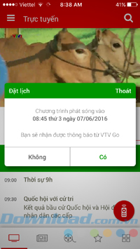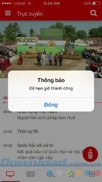 Hãy chú ý, bên dưới màn hình trình chiếu video là danh sách thứ tự các chương trình tiếp theo (hiện thị chi tiết thời gian và tên chương trình). Nếu muốn, chúng ta có thể hẹn giờ cho các chương trình đó bằng cách vuốt ngang, từ phải sang trái một chương trình bất kỳ, chọn hoặc Không trong thông báo đặt lịch để xác nhận.