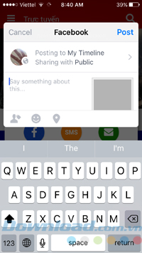 Một cách khác nữa để chúng ta có thể chia sẻ các video này, đó là vuốt ngang vào phần tên chương trình muốn chia sẻ (từ trái sang phải), sẽ xuất hiện giao diện chia sẻ như dưới đây. Chọn một mục để chia sẻ (ví dụ là Facebook), sau đó nhập các thông tin bổ sung rồi Post nó lên là ok.