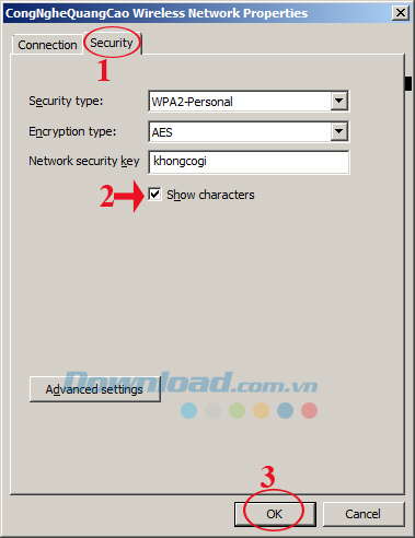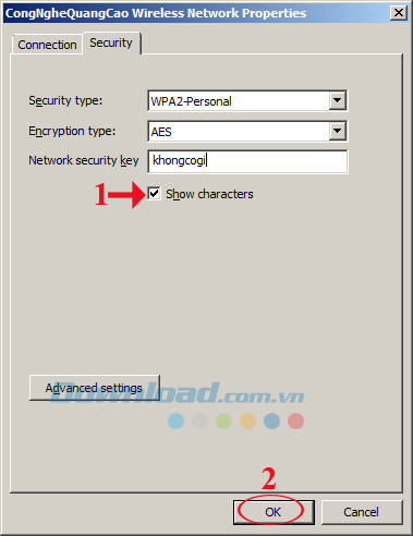 Bước 2: Cửa sổ CongNgheQuangCao Wireless Network Properties xuất hiện, tích chuột vào ô Show characters. Lúc này mật khẩu ở ô Network Security Key sẽ hiển thị ở dạng ký tự cho bạn xem dễ dàng (để đảm bảo an toàn thì theo mặc định ô này sẽ hiển thị *****). Khi đã xem được mật khẩu rồi thì nhấn OK để đóng cửa sổ này lại.