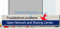 Bước 1: Click chuột phải vào biểu tượng cột sóng trên thanh Taskbar, chọn Open Network and Sharing Center.
