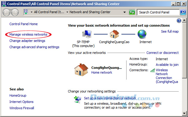 Bước 2: Ngay sau đó cửa sổ Network and Sharing Center xuất hiện, nhấn vào Manage wireless networks ở cột bên trái màn hình.