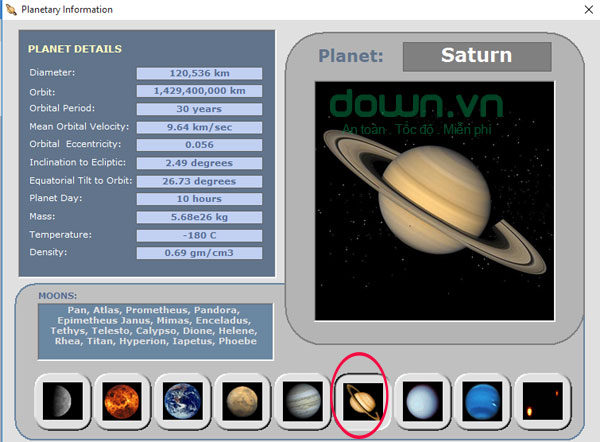Sau khi xem xong các thông tin cơ bản của Sao Thổ hãy tắt cửa sổ Planetary Information đi để quay lại giao diện chính quan sát chuyển động của Sao Thổ trên hệ mặt trời.
