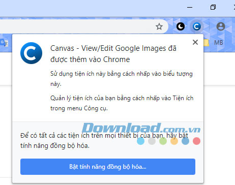 Khi cài đặt hoàn tất Chrome sẽ có thông báo thêm Canvas thành công và yêu cầu người dùng đồng bộ dữ liệu. Vậy là bạn đã hoàn thành việc bổ sung tiện ích Canvas cho Chrome thành công.