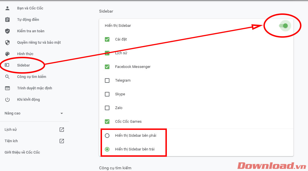 Đầu tiên các bạn cần vào trang coccoc://settings/sidebar, hoặc cũng thể vào phần cài đặt, chọn tab Sidebar. Ở dòng hiển thị sidebar, các bạn gạt trang phải để bật chức năng này. Nếu muốn thay đổi bên phải hoặc trái của sidebar, tích chọn dòng tương ứng ở phía dưới.