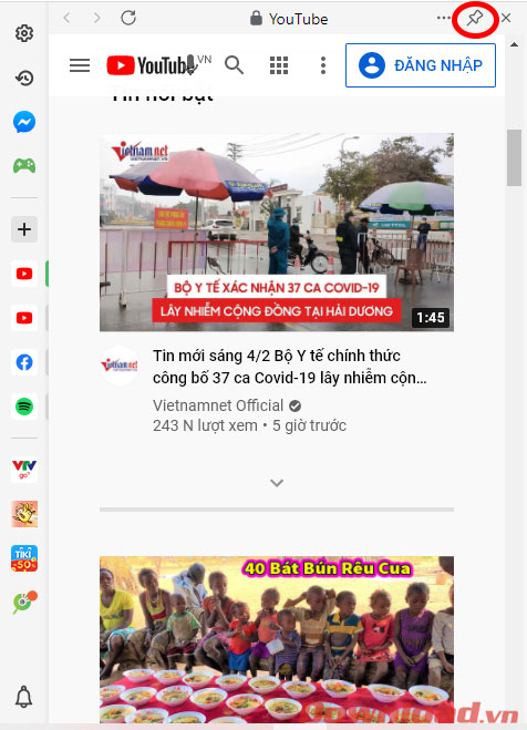 Sau khi mở cửa sổ phụ Youtube, người dùng cũng có thể thay đổi kích thước của sidebar bằng cách nhấn vào cạnh bên và kéo. Ngoài ra, nếu muốn ghim cửa sổ phụ này, các bạn nhấn biểu tượng ghim ở góc trên bên phải.