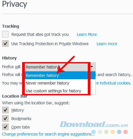 Chọn ghi nhớ hoặc không bao giờ ghi nhớ lược sử trên Firefox