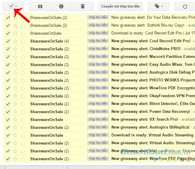 Tick vào ô vuông trên cùng để chọn toàn bộ email trong giao diện