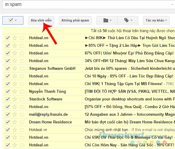 Tuy nhiên, những email nếu chỉ thực hiên cách xóa thông thường này (không phải là "xóa vĩnh viễn") thì chúng sẽ không mất đi, mà chỉ là tạm thời được di chuyển từ thư mục này (Hộp thư đến) sang thư mục khác (Thùng rác / Trash). Để có thể thực sự dọn sạch tài khoản, lấy lại dung lượng trống cho Gmail, các bạn cần truy cập tiếp vào Thùng rác, chọn toàn bộ thư trong đó và "Xóa vĩnh viễn - Delete forever".