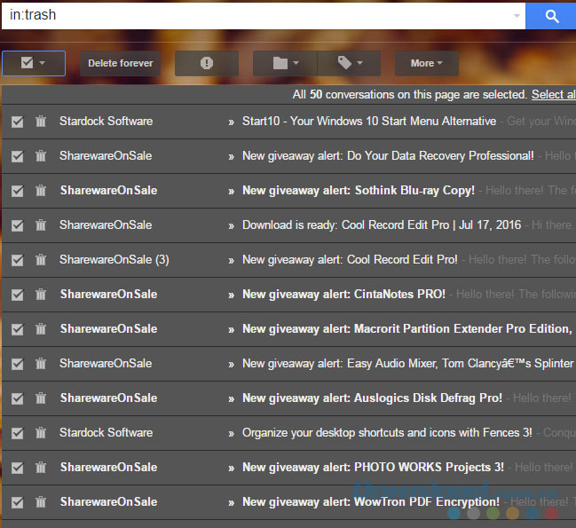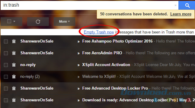 Ở đây, Download.vn muốn xóa toàn bộ email quảng cáo được gửi tới từ địa chỉ "sharewareonsale <admin@sharewareonsale.com>. Các bạn nhập từ khóa là "sharewareonsale " vào khung tìm kiếm rồi Enter.
