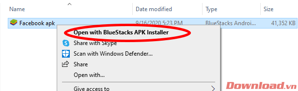Cách làm cũng cực kỳ đơn giản. Đầu tiên ta hãy tìm đến vị trí file APK muốn cài đặt. Sau đó nhấn chuột phải vào nó và chọn dòng Open with BlueStacks APK Installer.