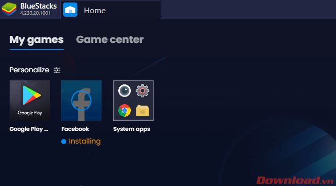 Đầu tiên ta mở trình giả lập BlueStacks lên. Ở màn hình chính chọn mục My games, sau đó nhấn nút tùy chọn ở cuối dòng Personalize, chọn tiếp nút Install apk.