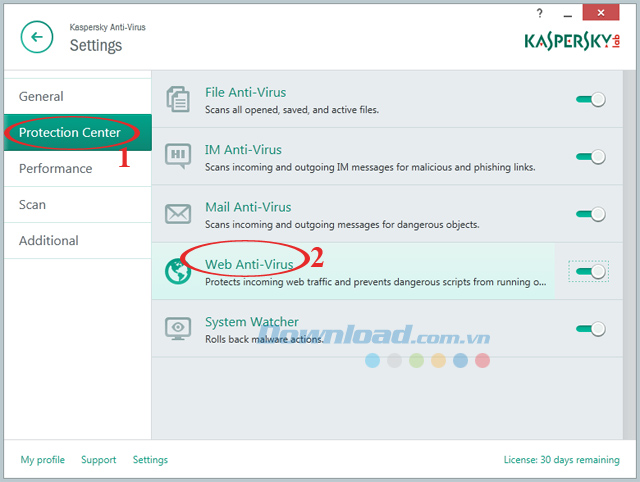Trên cửa sổ Settings nhấn vào thẻ Protection Center. Tại đây, bạn hãy nhấn vào dòng Web Anti-Virus để thiết lập cấp độ bảo mật.