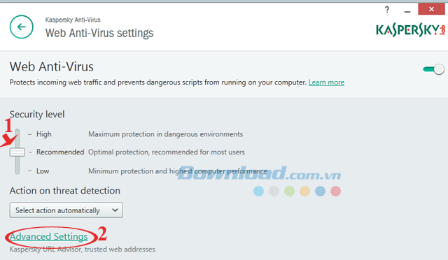 Tại cửa sổ Web Anti-Virus settings bạn có thể thiết lập các mức độ bảo mật sau: