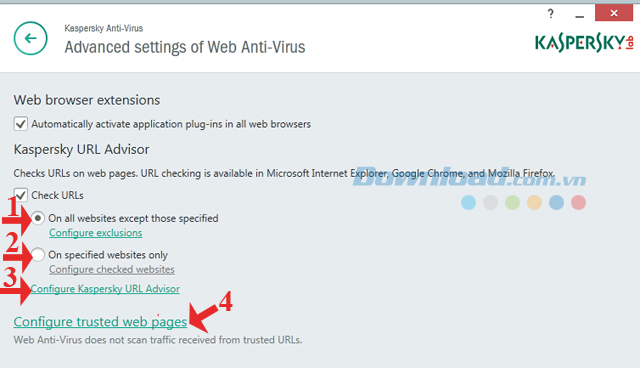 Cửa sổ Advanced settings of Web Anti-Virus xuất hiện bạn có thể thay đổi một số thông số sau: